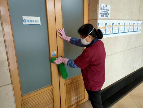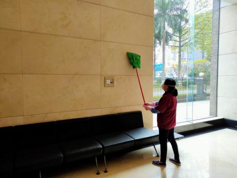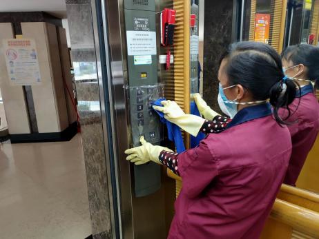▲電梯、門把手等人員常接觸的地方消毒