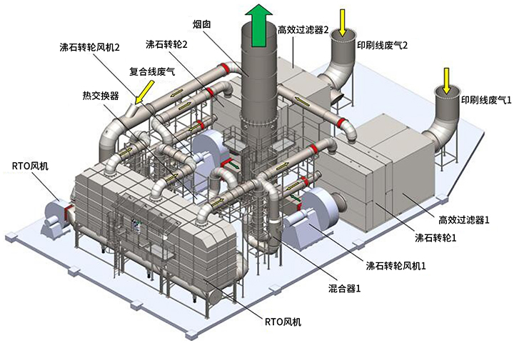 從2010年開始,與國內外(wài)專(zhuān)業的VOCs治理公司深入研(yán)究,分別設計不(bú)同的治理方案對印刷、複合等(děng)工藝產生的VOCs進行治(zhì)理(lǐ),VOCs廢氣穩定達標排放。其中針對印刷工序的VOCs治理,公司投資約4000萬(wàn)人民幣,與國外專業的VOCs治理公司合作,引進具備世界先進水平的軟包裝VOCs治理係統,采用“沸石轉輪濃縮+RTO燃燒+餘熱利用”的處理工藝,VOCs處理效率達(dá)95%以上,設計目標總VOCs排放濃度為50mg/m³,遠低於現行(háng)廣東(dōng)省地方標準《印刷行業揮(huī)發性有機化合物排放標準》(DB44/815-2010)總VOCs最高允許排放(fàng)濃度為120mg/m³的要求。
